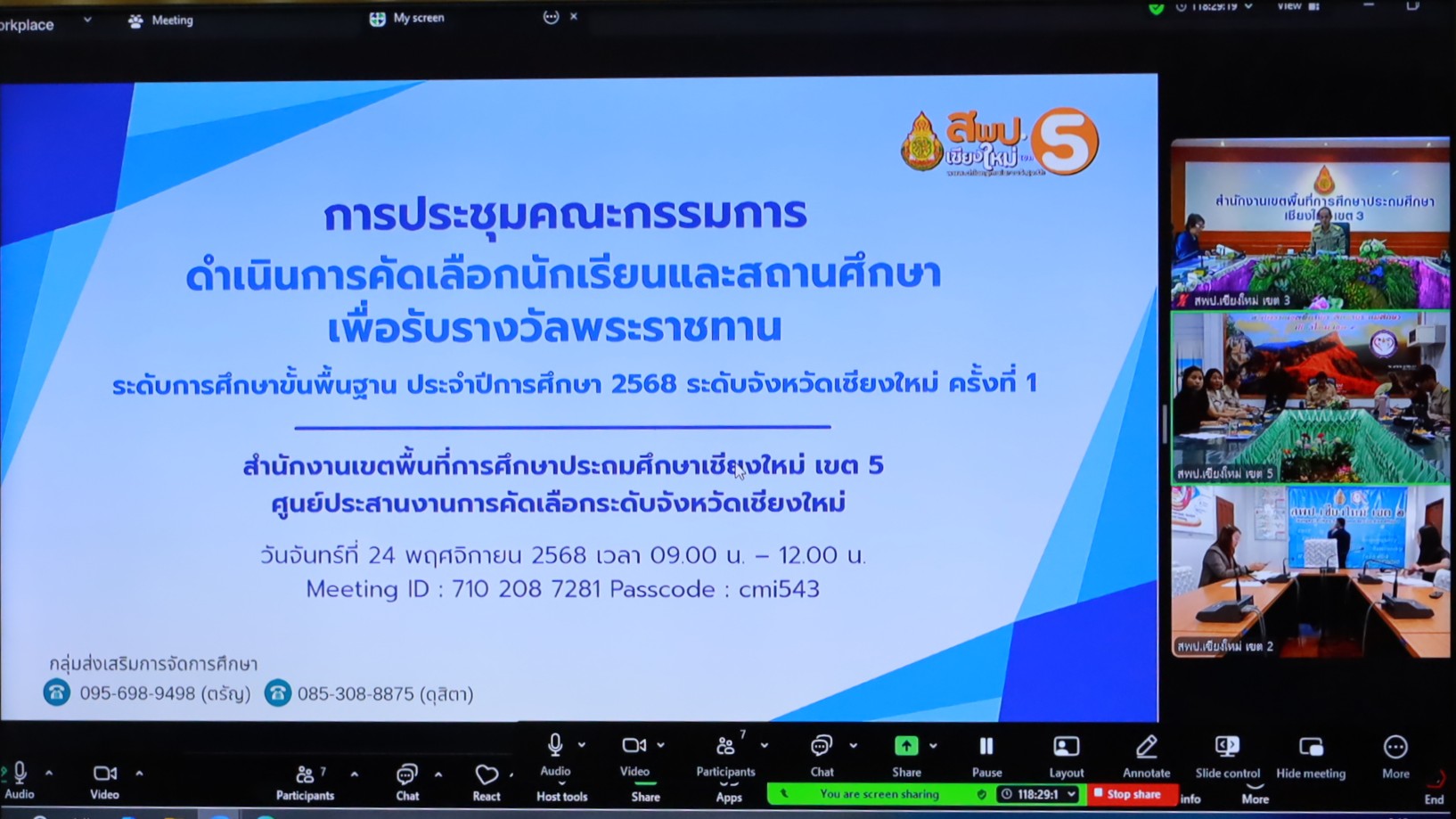 วันที่ 24 พฤศจิกายน 2568 นายประจักษ์ สระแก้ว ผู้อำนวยการสำนักงานเขตพื้นที่การศึกษาประถมศึกษาเชียงใหม่ เขต 5 พร้อมด้วย นายพงศ์ธร จิตรแม้น รองผู้อำนวยการสำนักงานเขตพื้นที่การศึกษาประถมศึกษาเชียงใหม่ เขต 5 นางสาวกีรติ การะบูรณ์ นักวิชาการศึกษาชำนาญการ ปฏิบัติหน้าที่ผู้อำนวยการกลุ่มส่งเสริมการจัดการศึกษา นางสาวจารุณี ศรีกันยา ศึกษานิเทศก์ชำนาญการพิเศษ นายตรัญ รักร่วม นักวิชาการศึกษาชำนาญการ นางสาวณัฐน์พิมล ไพศาลธารา นักวิชาการศึกษาปฏิบัติการ นางสาวดุสิตา สุทาบุญ นักวิชาการศึกษาปฏิบัติการ และนางสาวสมฤดี ขันตั้ง เจ้าหน้าที่กลุ่มส่งเสริมการจัดการศึกษา ประชุมคณะกรรมการดำเนินการคัดเลือกนักเรียนและสถานศึกษา เพื่อรับรางวัลพระราชทาน ระดับเขตพื้นที่การศึกษา ประจำปีการศึกษา 2568 ระดับจังหวัดเชียงใหม่ ครั้งที่ 1 ซึ่งคณะกรรมการจะดำเนินการคัดเลือก และส่งรายชื่อเข้ารับการประเมินในระดับจังหวัดต่อไป ณ ห้องประชุมสวนสน สพป.เชียงใหม่ เขต 5