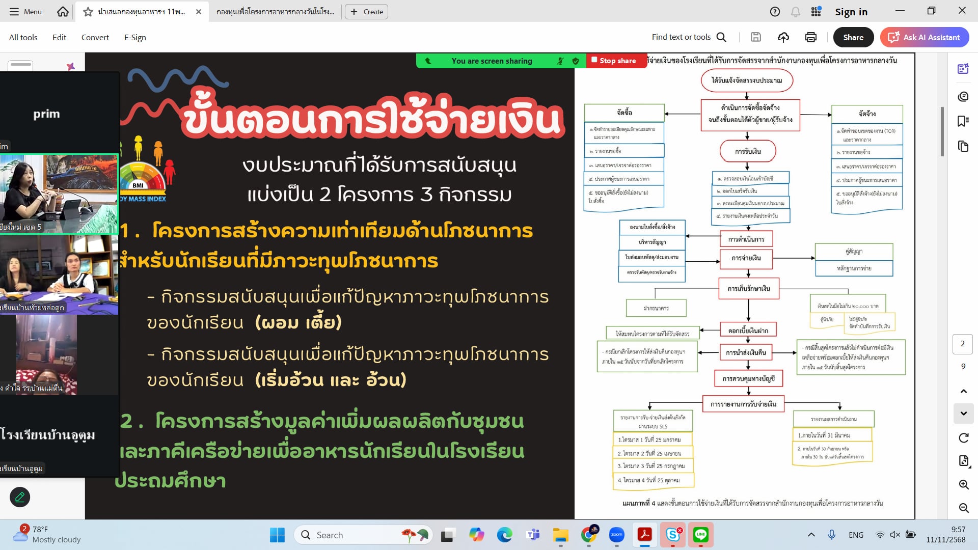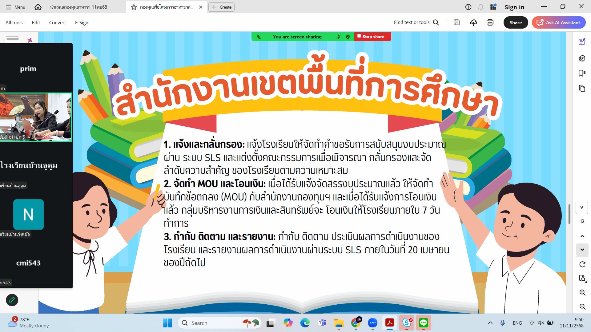 วันที่ 11 พฤศจิกายน 2568 นายประจักษ์ สระแก้ว ผู้อำนวยสำนักงานเขตพื้นที่การศึกษาประถมศึกษาเชียงใหม่ เขต 5 มอบหมายให้ นางสาวกีรติ การะบูรณ์ นักวิชาการศึกษาชำนาญการ ปฏิบัติหน้าที่ผู้อำนวยการกลุ่มส่งเสริมการจัดการศึกษา พร้อมด้วย ผู้บริหารสถานศึกษาและคณะครูโรงเรียนในสังกัด และนางสาวณัฐน์พิมล ไพศาลธารา นักวิชการศึกษาปฏิบัติการ ผู้รับผิดชอบโครงการฯ ร่วมประชุมชี้แจงการดำเนินงานกองทุนเพื่อโครงการอาหารกลางวันในโรงเรียนประถมศึกษา ผ่านระบบออนไลน์ (Zoom Meeting) โดยมี นางอริศรา กังแฮ ผู้อำนวยการกลุ่มบริหารงานการเงินและสินทรัพย์ ได้ชี้แจงการใช้จ่ายเงินที่ได้รับการจัดสรร ณ ห้องประชุมสวนสน สพป.เชียงใหม่ เขต 5