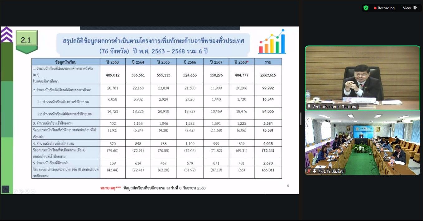 ประชุมติดตามผลการดำเนินโครงการเพิ่มทักษะด้านอาชีพแก่นักเรียนที่ไม่ได้เรียนต่อหลังจบการศึกษาภาคบังคับ ประจำปีงบประมาณ พ.ศ.2568