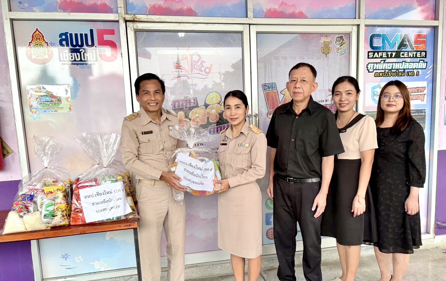 วันที่ 17 พฤศจิกายน 2568 นายประจักษ์ สระแก้ว ผู้อำนวยการสำนักงานเขตพื้นที่การศึกษาประถมศึกษาเชียงใหม่ เขต 5 มอบหมายให้ นายพงศ์ธร จิตรแม้น รองผู้อำนวยการสำนักงานเขตพื้นที่การศึกษาประถมศึกษาเชียงใหม่ เขต 5 พร้อมด้วย นายสุวิทย์ ยาประสิทธิ์ ผู้อำนวยการหน่วยตรวจสอบภายใน และเจ้าหน้าที่กลุ่มส่งเสริมการจัดการศึกษา มอบถุงยังชีพให้กับครอบครัวของนักเรียนโรงเรียนบ้านเด่นวิทยา อำเภอฮอด จังหวัดเชียงใหม่ จำนวน 6 คน ที่ประสบอุทกภัย โดยมี นางสาวสายรุ้ง หล่อใจ ผู้อำนวยการโรงเรียนบ้านเด่นวิทยา เป็นผู้รับมอบแทน เพื่อดำเนินการนำถุงยังชีพมอบให้กับครอบครัวของนักเรียนต่อไป